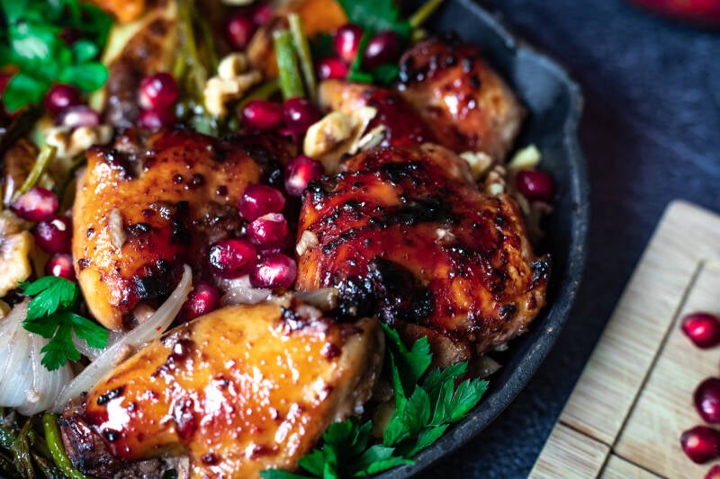 3. Snij de ui in halve ringen pers de knoflook of hak deze in kleine stukjes. Neem een ruime schaal. Voeg hier de zoete chilisaus, de soja saus, de honing, knoflook, ui, zout, peper en 150 milliliter van het granaatappelsap.